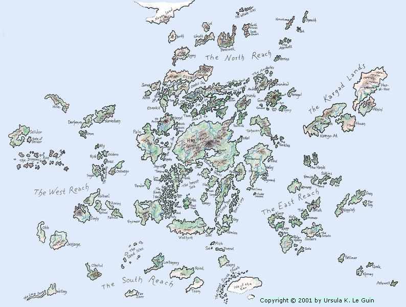 The term ‘archipelago’ is used by Le Guin to refer only to the central grouping of islands around the main island of Havnor and the Inmost Sea. The outlying islands are loosely grouped into four Reaches (The West, North, South and East), and the Kargad Lands, four large islands to the northeast inhabited by the warlike nation of the Kargs. Islands pivotal to the series include Roke and Havnor in the Inner Sea; Gont in the northeastern Archipelago, and Atuan, one of the Kargad lands.